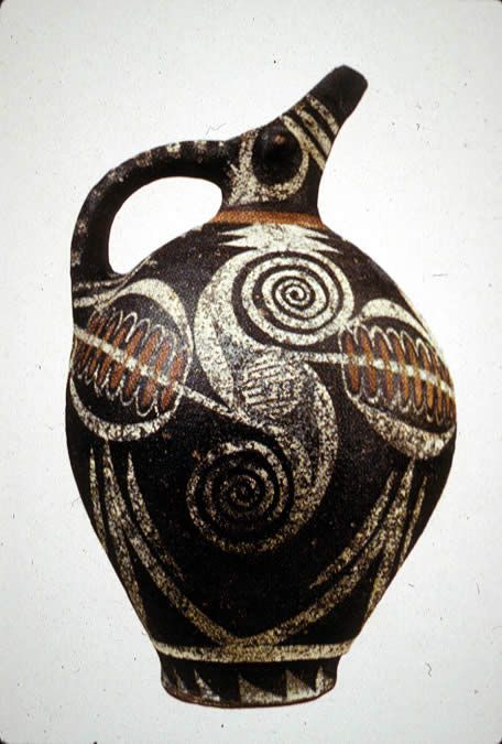New types of ceramics (fired clay with slip glazes) advanced rapidly due to the invention of the potter's wheel early in the second millennium BCE. Slips created by earth pigments created painted designs taken from natural (flora and fauna) life. Red / Browns / Blacks and white were the decorative slips for a great deal of the ceramic arts. Jugs, kraters, plates, bowls, covered jars. Remember the people of Aegean culture relished life in all its forms - including consumption of food and drink!